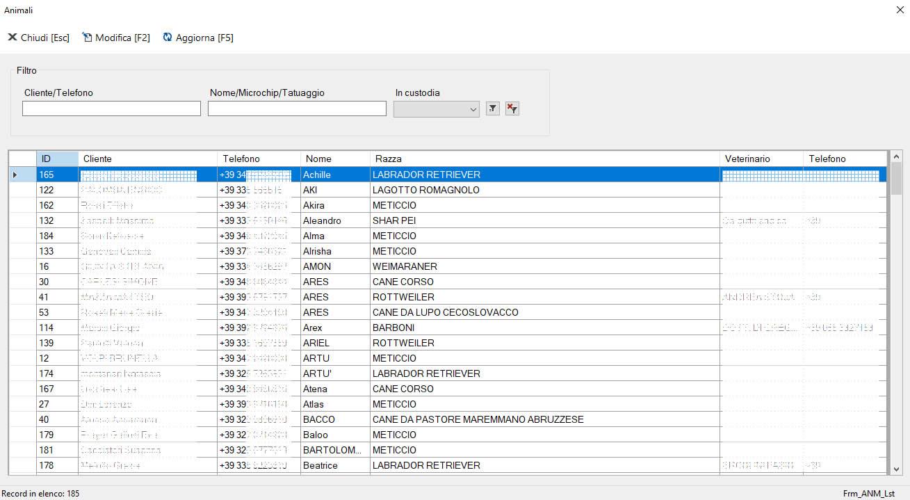 Funzione che visualizza l'elenco dei cani che sono stati registrati presso la struttura.