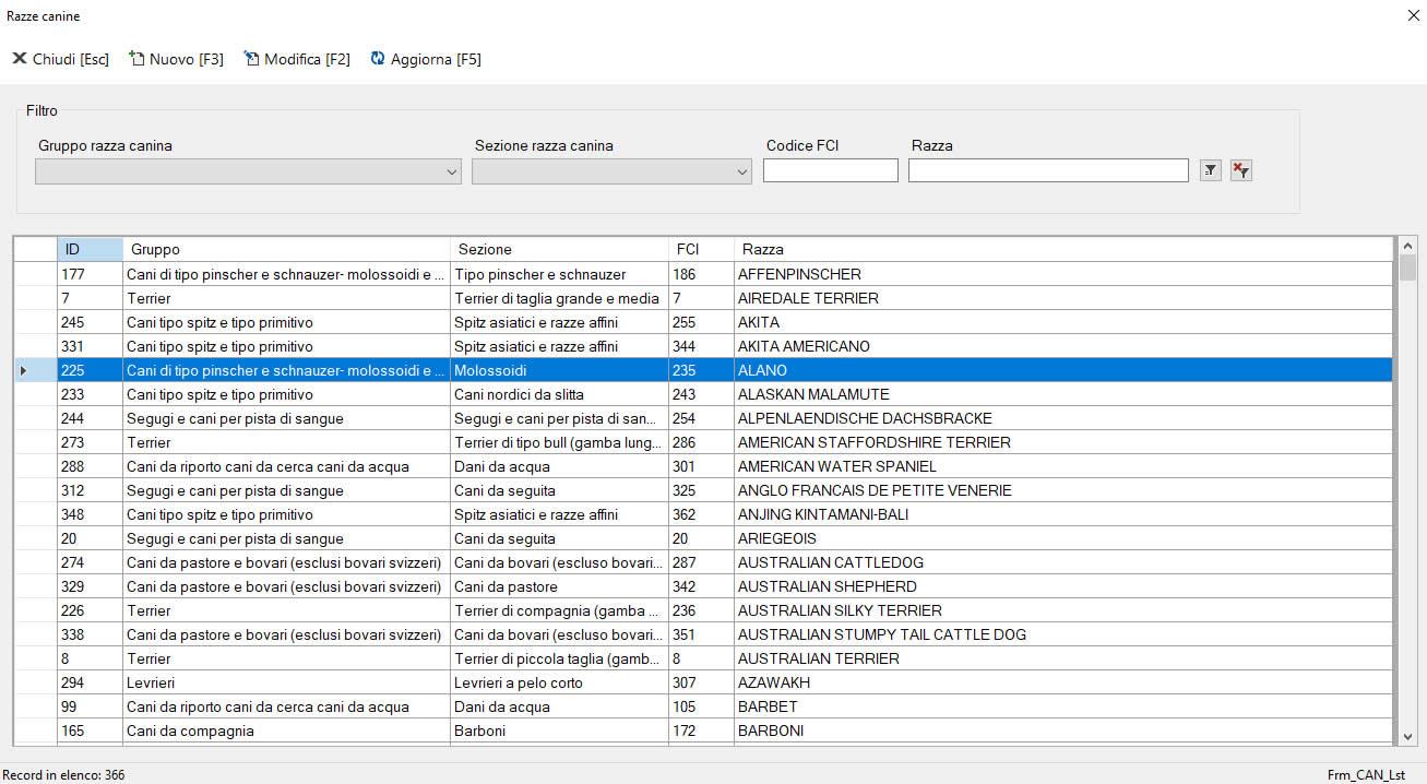 Il programma mette a disposizione le Razze canine per meglio identificare il cane nella sua scheda dedicata.