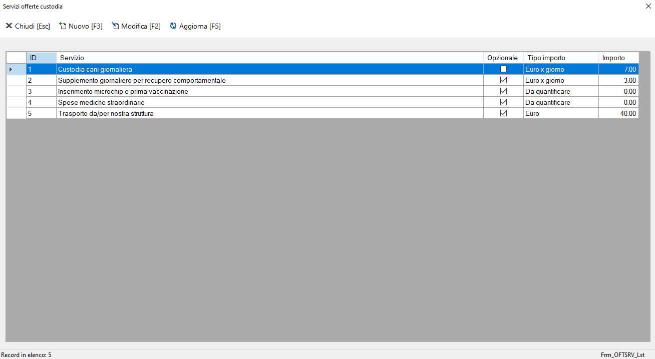 Funzione che consente la gestione dei servizi di base che la struttura può erogare quando propone un'offerta di ricovero per i cani ad un Ente, come ad esempio un Comune.